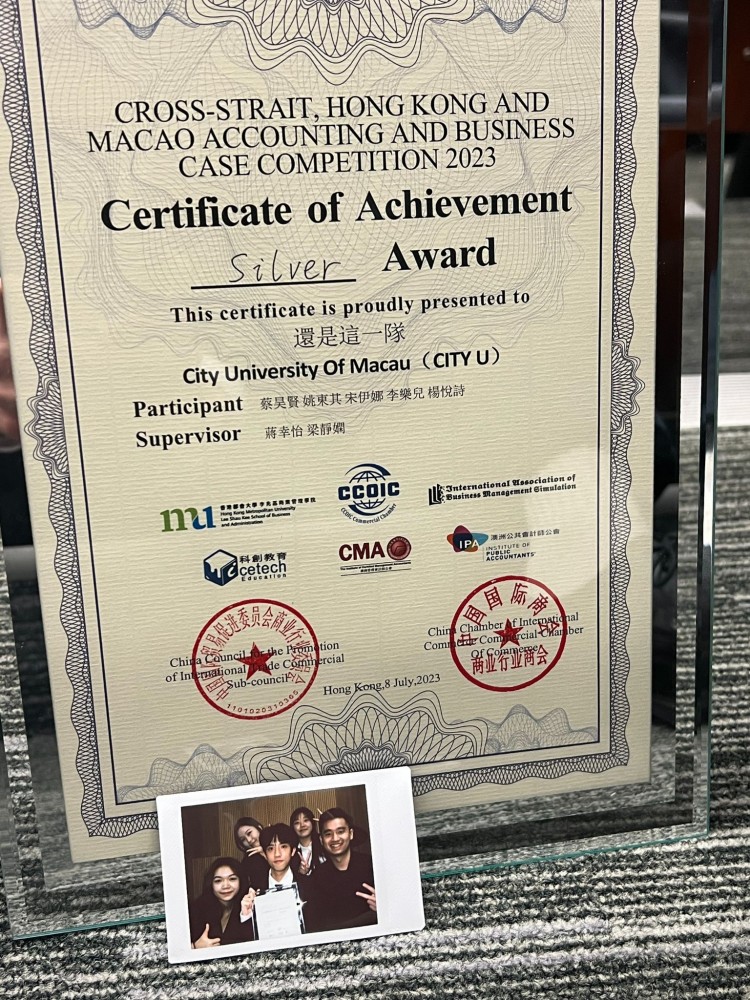 On July 8, the final and award ceremony of the “2023 Cross-Strait, Hong Kong, and Macao College Student Accounting and Business Management Case Competition”, sponsored by CCPIT and CCOIC, co-organized by (Hong Kong, China) Science and Technology Education and (Hong Kong, China) International Simulation Business Management, and supported by Hong Kong Metropolitan University, Australian Institute of Certified Management Accountants (CMA) and the Australian Institute of Public Accountants (IPA), was successfully held at Hong Kong Metropolitan University, with total 14 teams competing for the competition. The team “STILL THIS TEAM”, composed of five students from Faculty of Business, including Yueshi Yang, Leer Li, Yina Song, Dongqi Yao and Haoxian Cai has won the Certificate of Achievement Sliver Award under the leadership and guidance of Assistant Professor Tiffany Cheng Han Leung and Senior Lecturer Cathy Hang I Cheong of Faculty of Business.