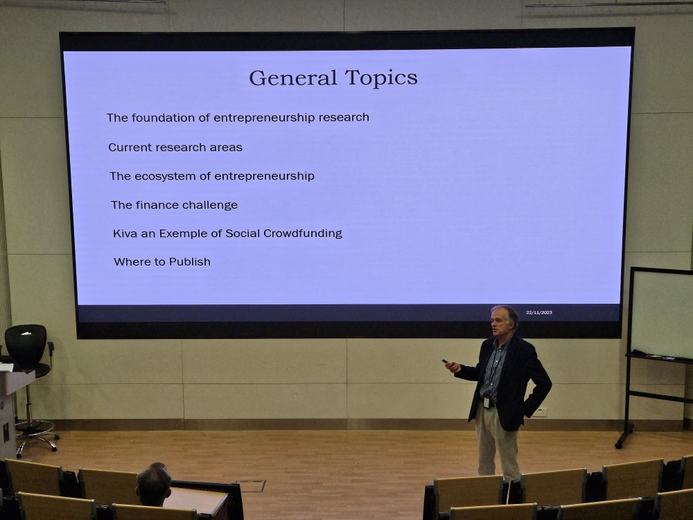 Prof. Jose Paulo Afonso Esperanca patiently explained each of the six subheadings, Including "The foundation of entrepreneurship research", "Current research areas", "The ecosystem of entrepreneurship", The finance challenge", Kiva an Exemple of Social Crowdfunding" and "Where to publish".