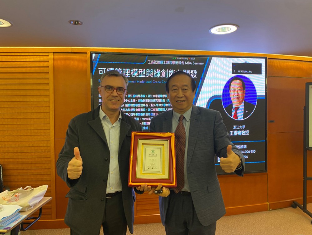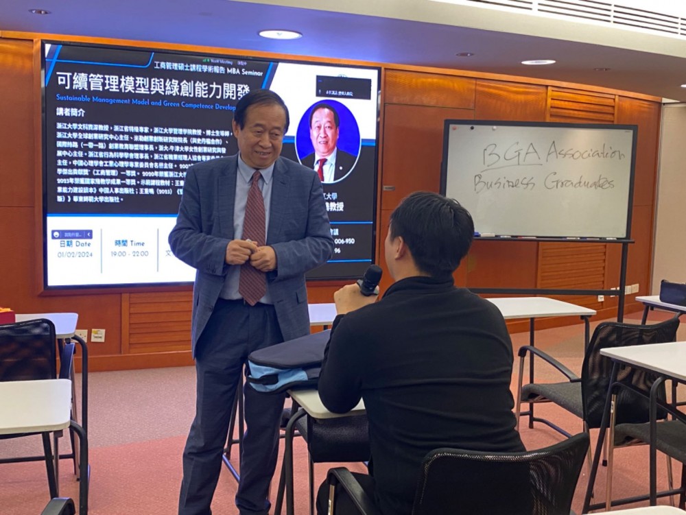 Prof. Wang delivered a lecture on the topic of "Sustainable Management Model and Green Innovation Capacity Development." He first explained the three major trends in business education: competence development, industry upgrading, and green transformation. He illustrated current industry practices about green innovation, which triggered a fruitful debate with the students.