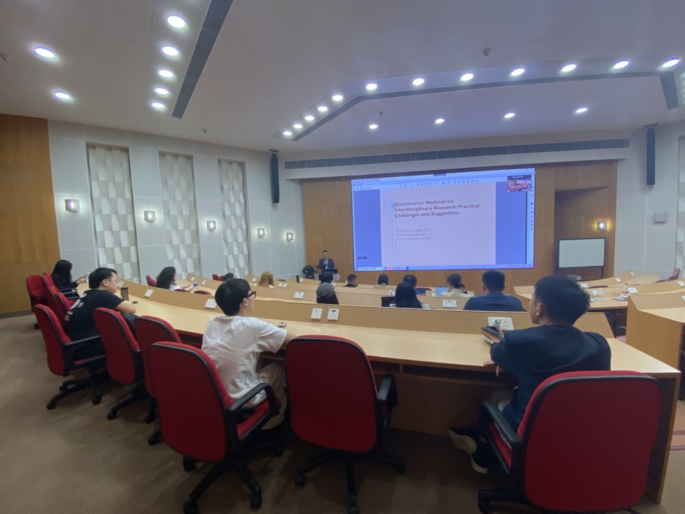 In his lecture, Prof. Xie traced the historical development of quantitative methods and highlighted the key quantitative paradigms in contemporary science. Drawing from pioneering topics in business, finance, and economics, Prof. Xie explained how qualitative and quantitative thinking jointly enhances our understanding of the physical world and society. He encouraged students to enthusiastically explore the benefits of booming technologies including scientific computing and AI, and align their research interests with practice and industry driven problems, especially those strategically important to the social and economic development in Macau and the Great Bay Area. Prof. Xie suggested that good research arises when interacting with people, thus students are encouraged to keep connected by attending various academic activities including seminars and colloquiums.
