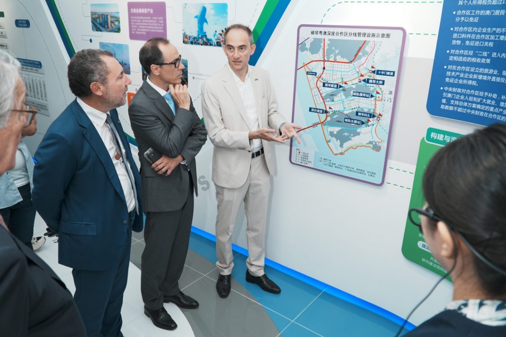 The following day, accompanied by Dean José Alves, Ambassador António Martins da Cruz, and the delegation visited the Guangdong-Macao Deep Cooperation Zone in Hengqin to inspect the development on-site. They visited the exhibition hall of the Guangdong-Macao In-Depth Cooperation Zone in Hengqin and the Huafa Cross-border E-commerce Industrial Park. Under the host of Director Antonio Lei of the Economic Development Bureau of the In-depth Cooperation Zone, the guests met senior managers of companies based in Hengqin and looked forward to future cooperation.