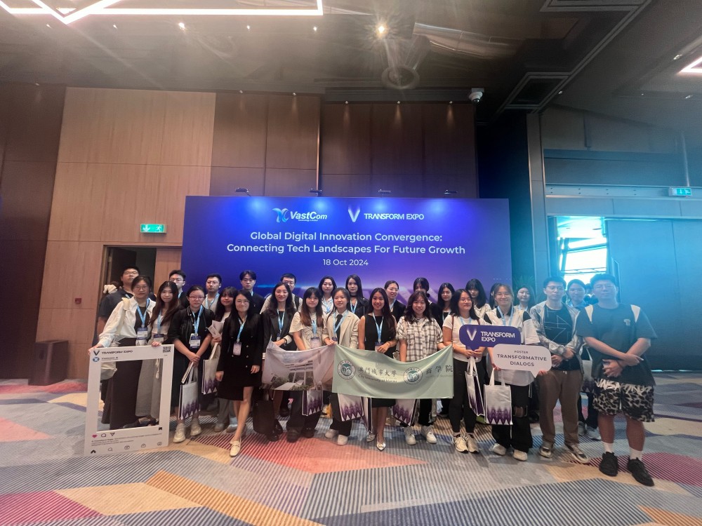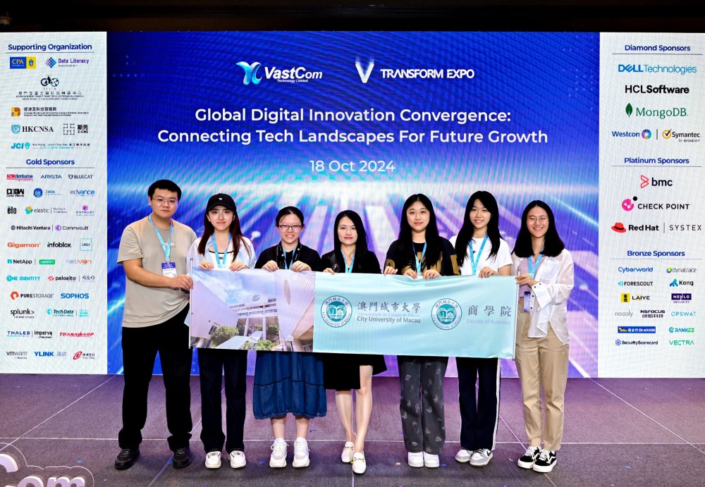 On October 18, 2024, students and professors from the Faculty of Business participated in the V-Transform Expo hosted by Vastcom Company at the Macau Tower. The event, themed “Global Digital Innovation Convergence: Connecting Tech Landscapes for Future Growth,” showcased the latest progress in natural language technology development, system security detection and maintenance, cloud computing services, and digital transformation.