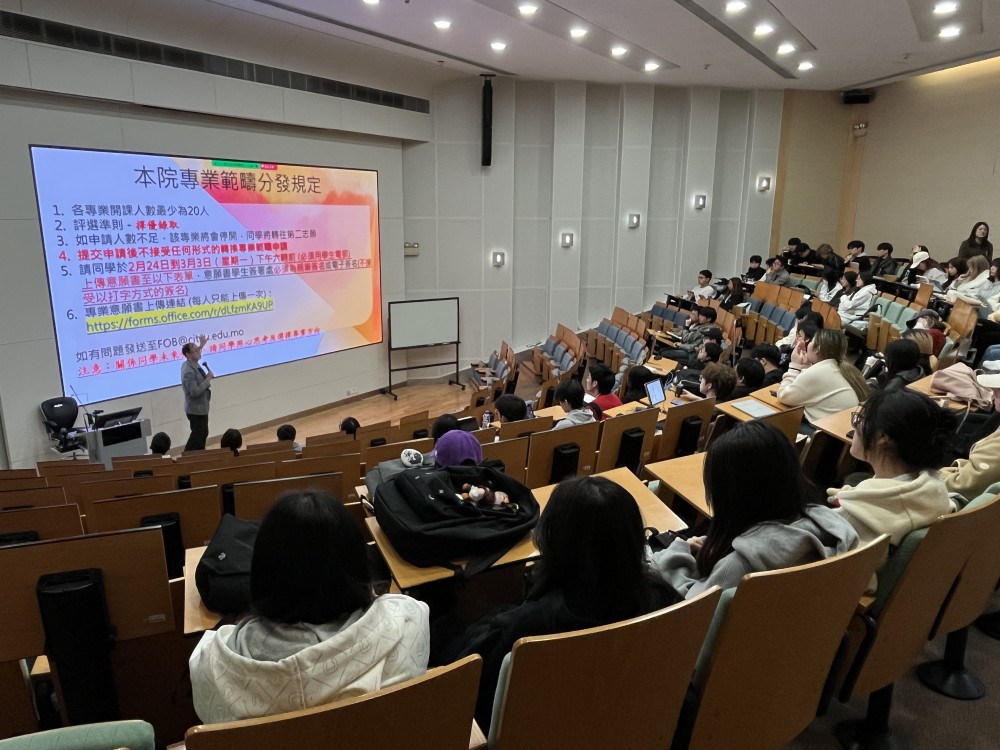 The 2023-2024 BBA Major Selection Briefing Session was successfully held on January 22. The session was hosted by Assistant Professor Bowen Dong, Programme Coordinator of BBA Programme, and presented by Associate Professor Farzad Sabetzadeh, Programme Coordinator of IBC Programme, Assistant Professor Kaidong Yu, Assistant Professor Xunzhuo Xi, Assistant Professor Limeng Yu, and Senior Lecturer Wei Wei Seah.