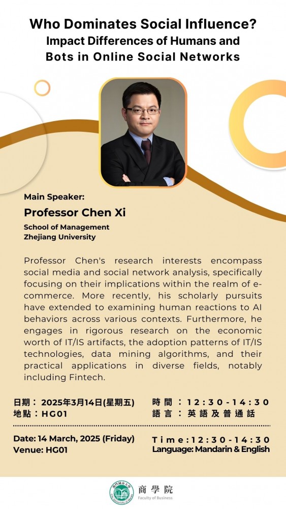 Professor Chen's research interests encompass social media and social network analysis, specifically focusing on their implications within the realm of e-commerce. More recently, his scholarly pursuits have extended to examining human reactions to AI behaviors across various contexts. Furthermore, he engages in rigorous research on the economic worth of IT/IS artifacts, the adoption patterns of IT/IS technologies, data mining algorithms, and their practical applications in diverse fields, notably including Fintech.