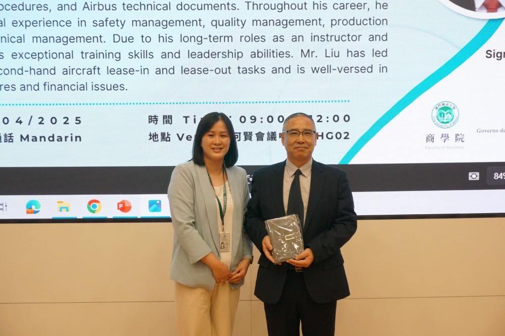 The seminar featured Mr. Marston Liu, Quality Assurance Manager of Air Macau Company Limited, as the keynote speaker. He delivered a presentation titled "Macau Aircraft Leasing Center: New Opportunities to Strengthen Aviation Development in Portuguese-Speaking African Countries." Mr. Liu provided an in-depth analysis of the current commercial aircraft market, offering professional insights into the technical features and market performance of mainstream models such as the Boeing 737 and Airbus A320 series. He also shared practical risk management strategies in aircraft leasing operations.