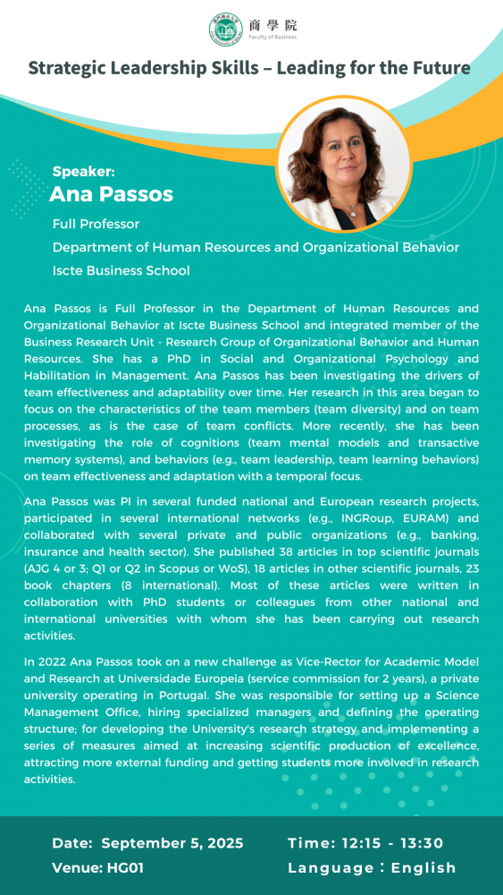 Ana Passos is Full Professor in the Department of Human Resources and Organizational Behavior at Iscte Business School and integrated member of the Business Research Unit - Research Group of Organizational Behavior and Human Resources. She has a PhD in Social and Organizational Psychology and Habilitation in Management. Ana Passos has been investigating the drivers of team effectiveness and adaptability over time. Her research in this area began to focus on the characteristics of the team members (team diversity) and on team processes, as is the case of team conflicts. More recently, she has been investigating the role of cognitions (team mental models and transactive memory systems), and behaviors (e.g., team leadership, team learning behaviors) on team effectiveness and adaptation with a temporal focus.