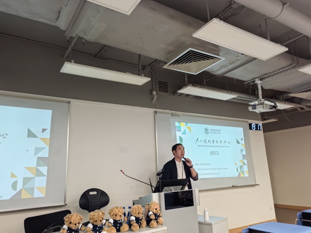 Mr. Tong provided an in-depth introduction to the various resources and support offered by the ECC of our university, covering aspects such as entrepreneurial thinking, concepts, mentoring mechanisms, and successful entrepreneurial incubation cases. He also detailed the business environment in Macau and the support available for youth entrepreneurship across the Greater Bay Area. Mr. Tong particularly emphasized the opportunities and resources available this year for students and alumni to apply for residency at the ECC, encouraging students to actively participate in innovation and entrepreneurship activities.