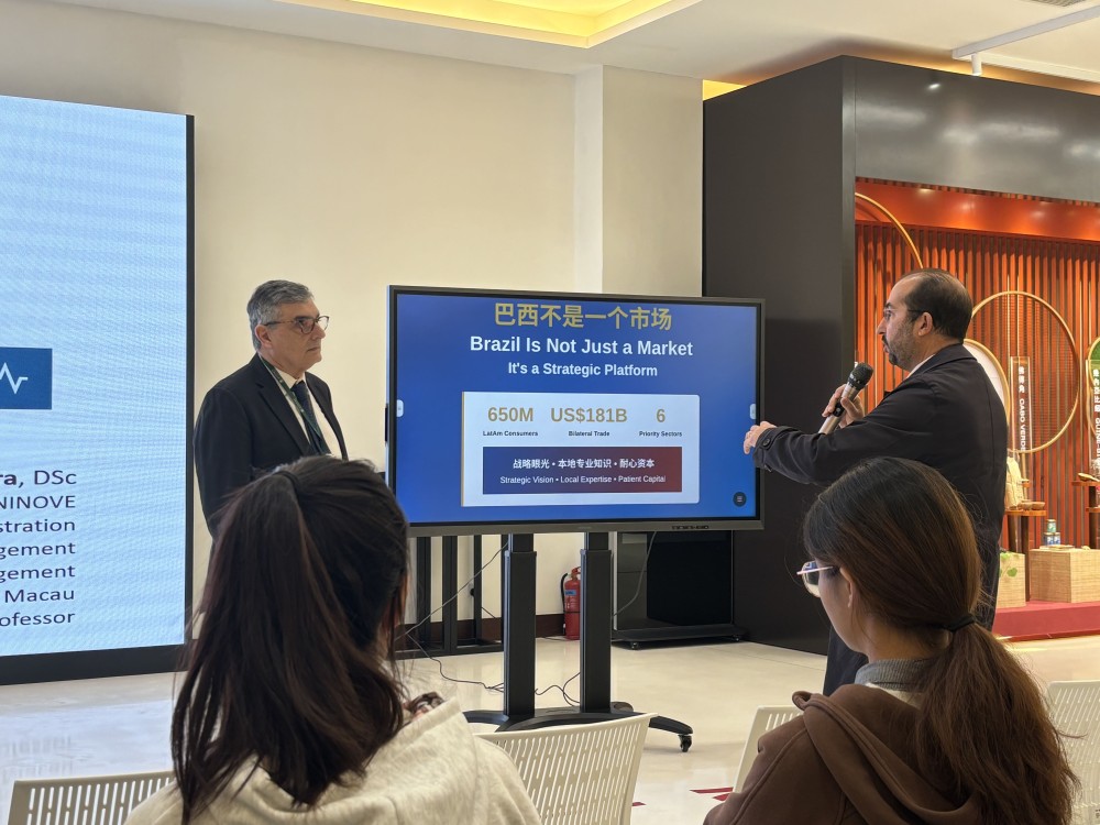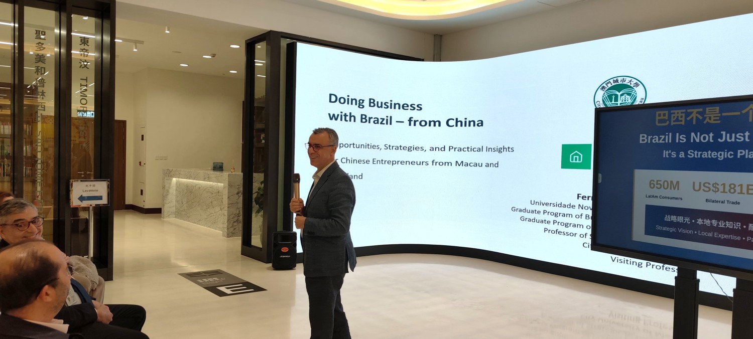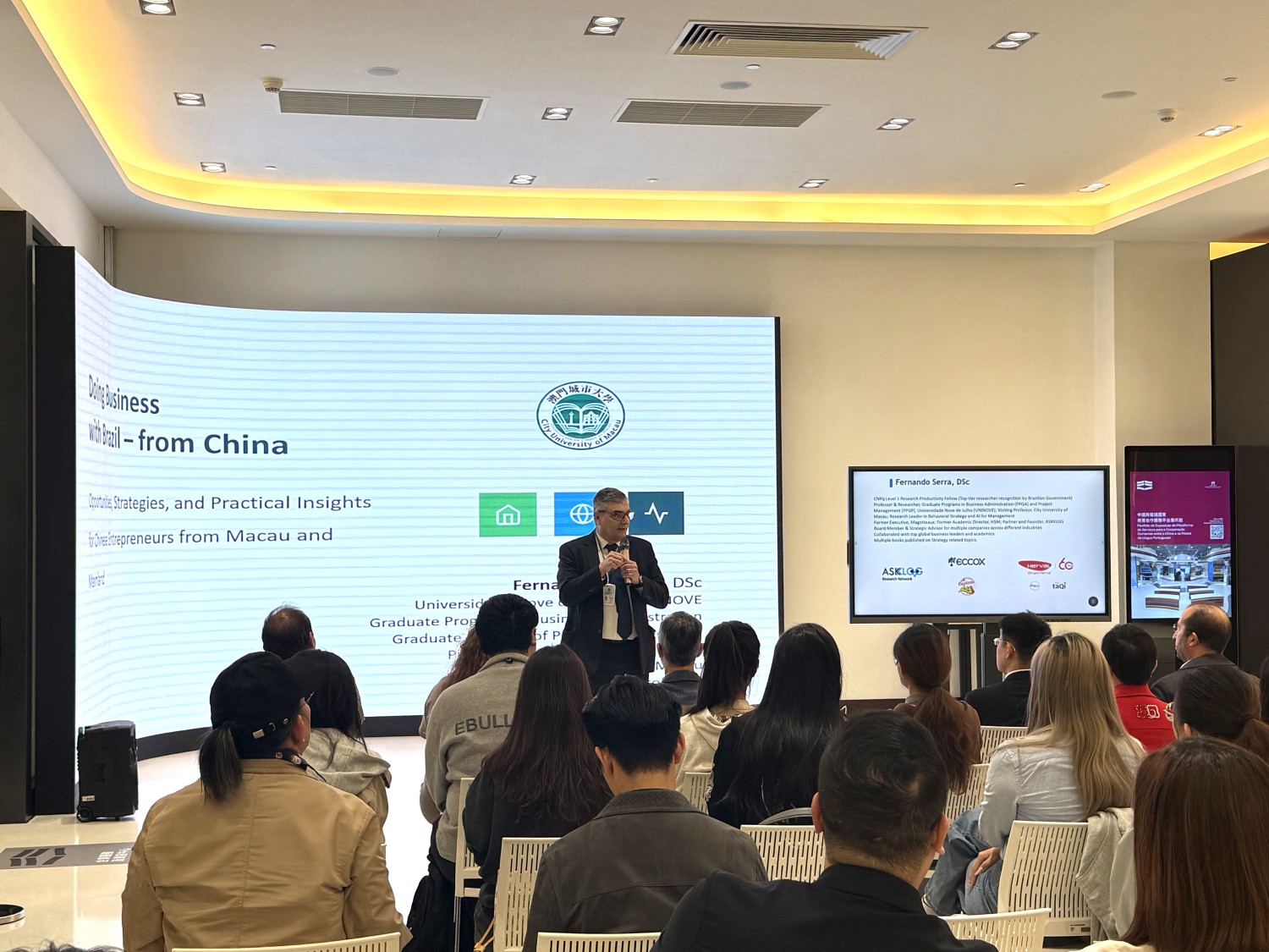 On 21 November, the Faculty of Business of the City University of Macau hosted a thematic lecture titled “Doing Business with Brazil – from China” at the China–Portuguese-Speaking Countries Commercial and Trade Service Platform Exhibition Hall. Professor Fernando R. Serra, a professor of Universidade Nove de Julho-UNINOVE, and also a visiting professor of CityU Macau, was the keynote speaker. Senior Manager Weng Hei Tang from the Macau Commerce and Investment Promotion Institute (IPIM), Dean of the Faculty of Business of CityU Macau, Prof. José C. Alves, along with faculty members, students, and industry representatives, attended the event.