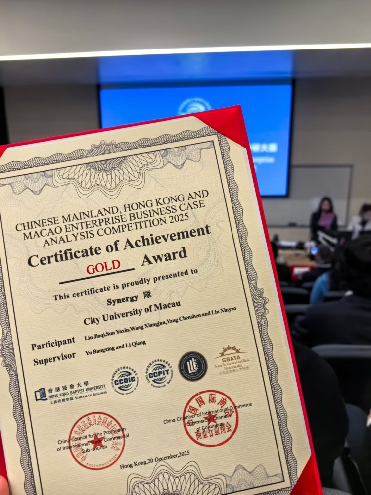 On December 20, 2025, the "2025 Mainland, Hong Kong, and Macau Enterprise Business Case Analysis Competition," hosted by Hong Kong Baptist University, successfully concluded. The team representing the Faculty of Business and Faculty of Finance at City University of Macau delivered an outstanding performance in the competition. With exceptional case analysis skills and innovative business solutions, they stood out among numerous participating teams and won the Gold Award, demonstrating the solid professional competence and excellent teamwork of City University's students.