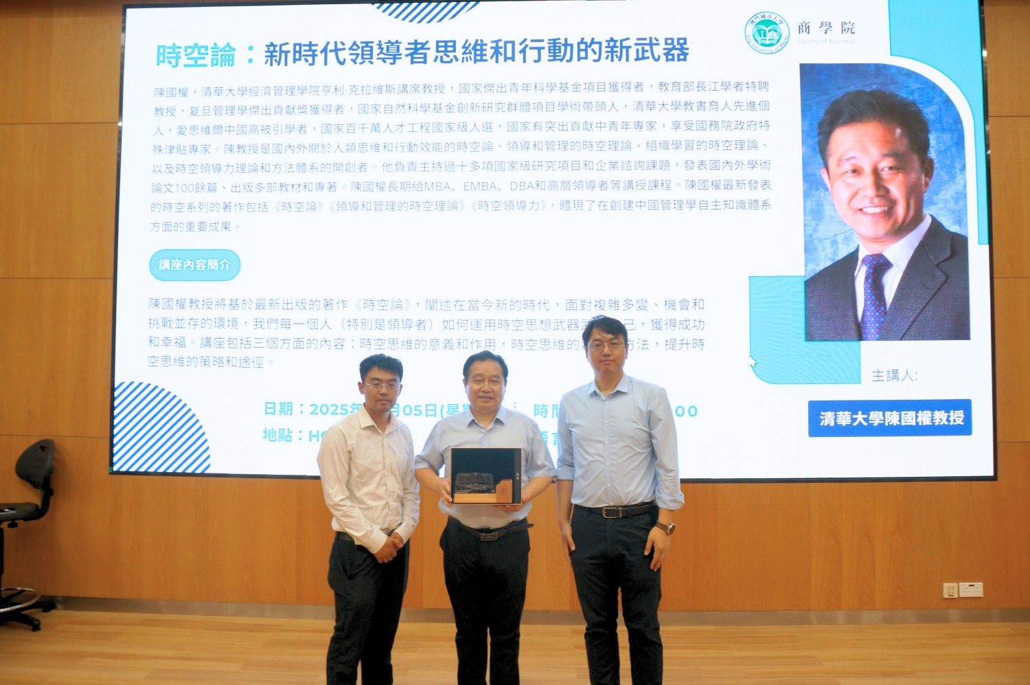 September 5, 2025, The Faculty of Business at City University of Macau was fortunate to invite Professor Guoquan Chen, an internationally renowned management scholar from Qinghua University, delivered an intellectual feast on his groundbreaking "Spacetime Theory" for DBA students and scholars from both within and outside the institution. Confronted with limitless opportunities and challenges in life, a central aim of this lecture was to explore how to equip oneself with spacetime thinking. The discussion was structured around three key dimensions: the significance and function of spacetime thinking, the types and methodologies of spacetime thinking, and strategies and pathways to enhance spacetime thinking.